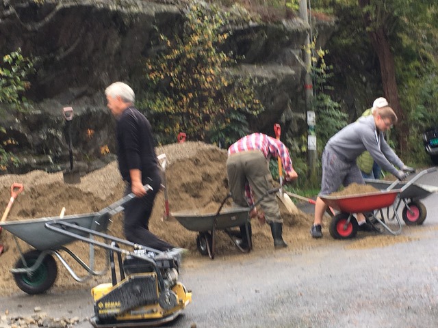 Det var derfor et ønske fra mange om å gjøre en innsats for å bygge opp stien igjen, og etter litt samtale med Helge fikk vi lov til å grave en dreneringsgrøft og legge ned rør inne på deres tomt slik at vannet ikke renner ut på den nedre delen av stien. Kommunen sponset oss med 15m3 med subbus, og i tillegg kjøpte vi inn nær 4 m3 med grov pukkstein. En særdeles dedikert gjeng stilte med nødvendig redskap og gikk løs på oppgavene for et enda bedre miljø i Hellvikskog.