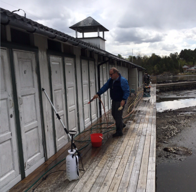 Ettersom maling av en del av badehuset sto på programmet, var det en entusiastisk gjeng av frivillige som tidlig i uken vasketveggen mot vest og vasket / grønsåpe - impregnerte dekket. All svertesopp og nedfall fra vinteren ble fjernet og badehuset var klar for innrykk av ivrige velmedlemmer på lørdag.
